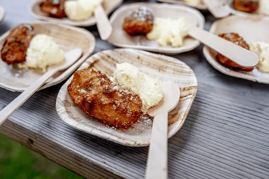 Fried vanilla wafer battered bananas, French vanilla pudding, and cookie crumbles topped with powdered sugar.