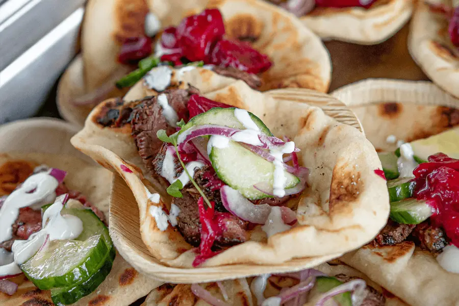 Sliced tri-tip on naan, beet burnt ends, cucumber and onion salad, and cilantro. Ingredients supplied by Simpsons Meats.