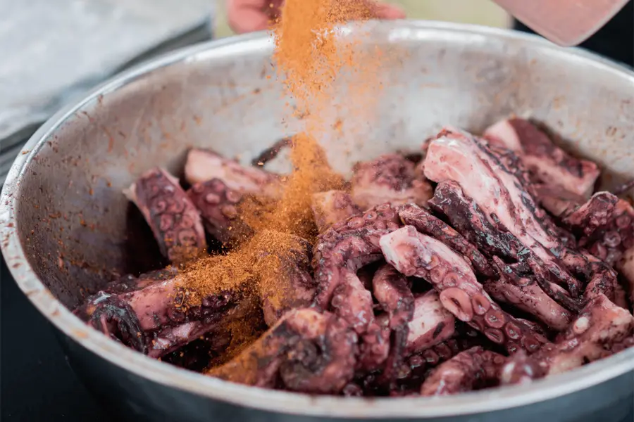 Charred octopus with grilled lamb loin served over the ancient grain FONIO. Ingredients supplied by Tuten Farm.