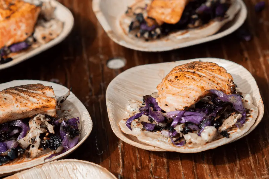 Cured salmon with blue corn tortilla, Gannon Organic cabbage, tajin spice, and egg yolk jam.