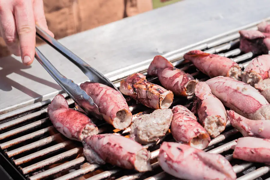 Sausage stuffed grilled squid from Marshland Seafood, spaghetti squash, capers, pine nuts, grilled orange & spring onion vinaigrette.